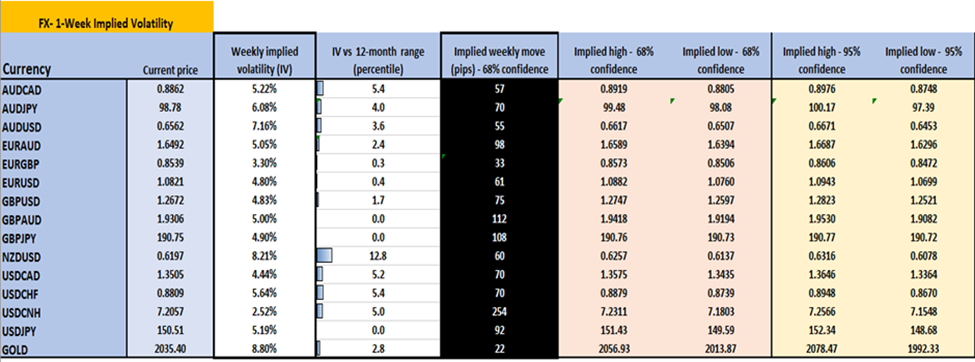 如果我们再次查看G10货币对和黄金的1周隐含波动率,我们会发现它们处于52周内的最低水平(或12个月范围的零百分位)。通过复制期权策略中使用的计算,比如每周的“跨式套利”(可根据要求发送计算),我们可以看到预期的价格波动 – 更高或更低,并且具有68.2%和95%的置信水平 – 本周价格预期达到的水平。一些人将其用于风险管理目的,其他人用于均值回归入场信号。