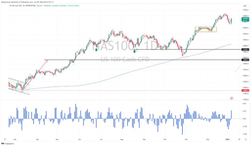 就在你开始感觉到风险资产(如股票)可能会进入一个更长时间的下跌期,各位联邦储备银行成员谈论到金融环境的放松减少了降息的需求时,我们看到NAS100、US500和US2000出现了强劲反弹。