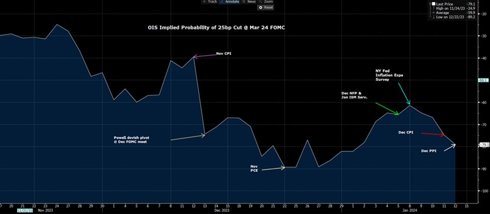 一些人认为美国CPI数据使美联储在三月份放松政策的空间减小了。也许是这样……但当我们从CPI和PPI中提取出影响核心PCE计算(1月27日发布)的组成部分,估计环比增长大约为0.2%,这使得核心PCE的6个月年化增长率为2%左右 – 考虑到核心PCE是美联储制定政策的重点 – 就这样,我们有了一个明确的理由来解释为什么债券和利率市场认为三月是降息启始点。