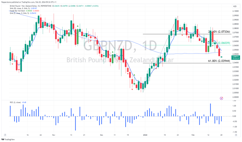 当美国大盘指数关注英伟达的财报(周三盘后)时,有人开始思考如果我们看到NAS100和US500指数出现下行和波动,是否会有一部分资金流入美国小盘股 – US2000指数在这里是一个很好的代理。从US2000指数的行业构成来看,我们看到18.7%的指数权重偏向于工业股,而15.2%偏向于金融股,这表明对美国10年期国债的敏感性较高。因此,美国10年期国债的上涨将有助于指数的上行。交易者还可以通过超微电脑(权重为0.52%)获得人工智能主题的杠杆机会,近来该股的波动性非常大。鉴于MicroStrategy的市值为118.7亿美元,它的权重排名第二,因此指数也存在高贝塔驱动的因素。在较高时间框架上的设置还需要进一步完善,但已经引起关注- 自10月至12月强劲上涨了27%之后,价格回撤至38.2%斐波纳契水平,形成了一个底部,并重新测试2073的高点。设定警报以捕捉多头突破,如果收盘价超过此水平,将为持续上涨打下坚实的基础。
