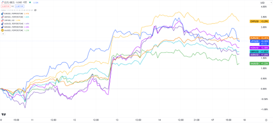 如果以美元指数的权重货币来看,欧元兑美元上涨了2.4%,日元兑美元的涨幅也较为亮眼。