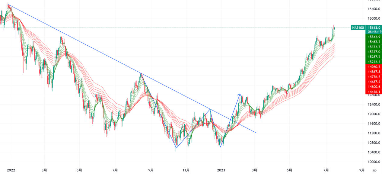 在经济软着陆的情况下,交易员们正全力押注于“金发姑娘”情景,即美联储结束加息,股市将出现大规模繁荣。NAS100指数已经如离弦之箭,一发不可收拾,似乎任何回调事后都被证明是小调整。日图价格依旧在GMMA顾比均线的短期组之上,甚至连长期组上沿都没触及。