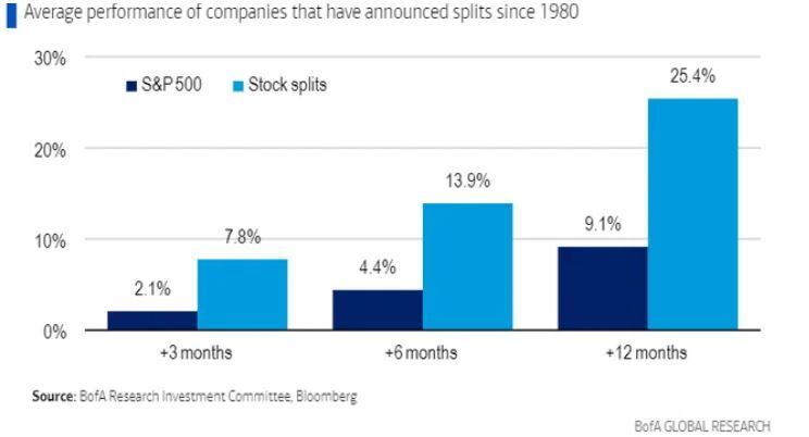下图是美国银行对1980年以来标普500成分股宣布拆股计划后的走势分析,在3、6、12个月的周期内,股价的平均涨幅远高于大盘。当然,这只是一个市场平均情况,并且涵盖了经济运行的不同周期。