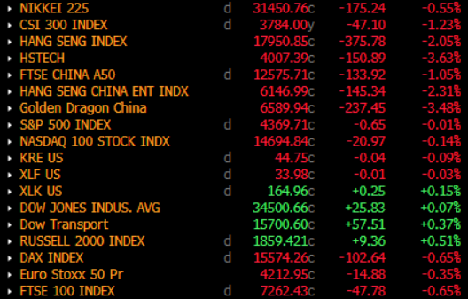 图1. 上周股市亚洲板块整体收跌,数据来源:Bloomberg Terminal