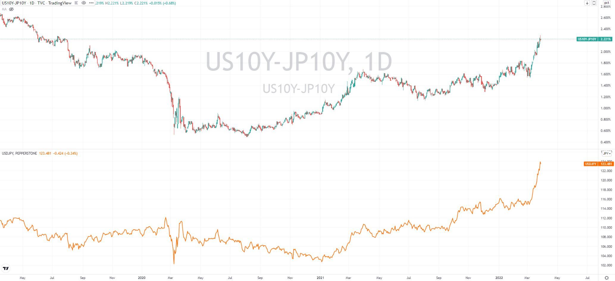 下图显示,美国和日本的10年期国债利差已经拉大到220个基点,是去年8月的两倍左右。资本显然会流向具有更高收益率的地方,因此USDJPY在同期一路上涨。