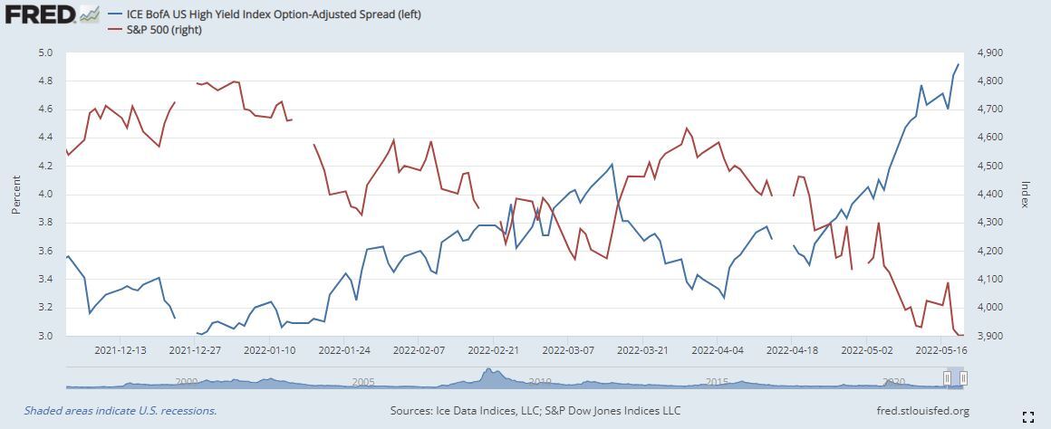 另一个参考指标是美国高收益率债券和10年期国债的利差(蓝线),目前已经接近5%,若进一步拉大无疑将拖累股市(红线)的表现。
