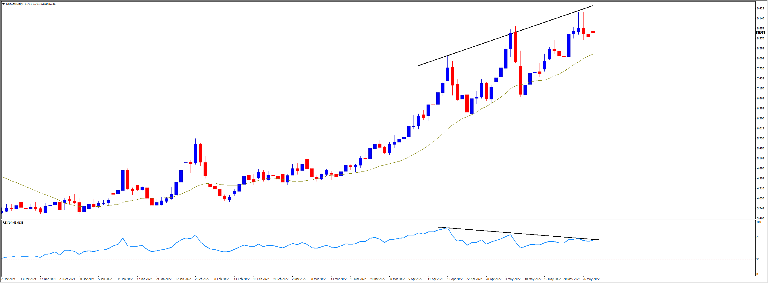 天然气(NatGas)的技术指标在日线图上的背离增加了价格回落的风险。