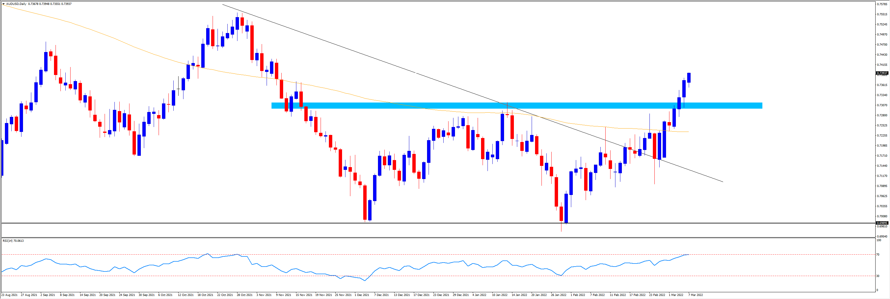 澳元上周上涨近2%,收于近4个月新高0.7374,为连续第五周收涨。